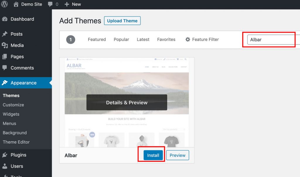 From there, you’ll be able to search for free themes. You can also upload your own themes if you’ve purchased one. Go ahead and search for the ‘Albar’ theme.