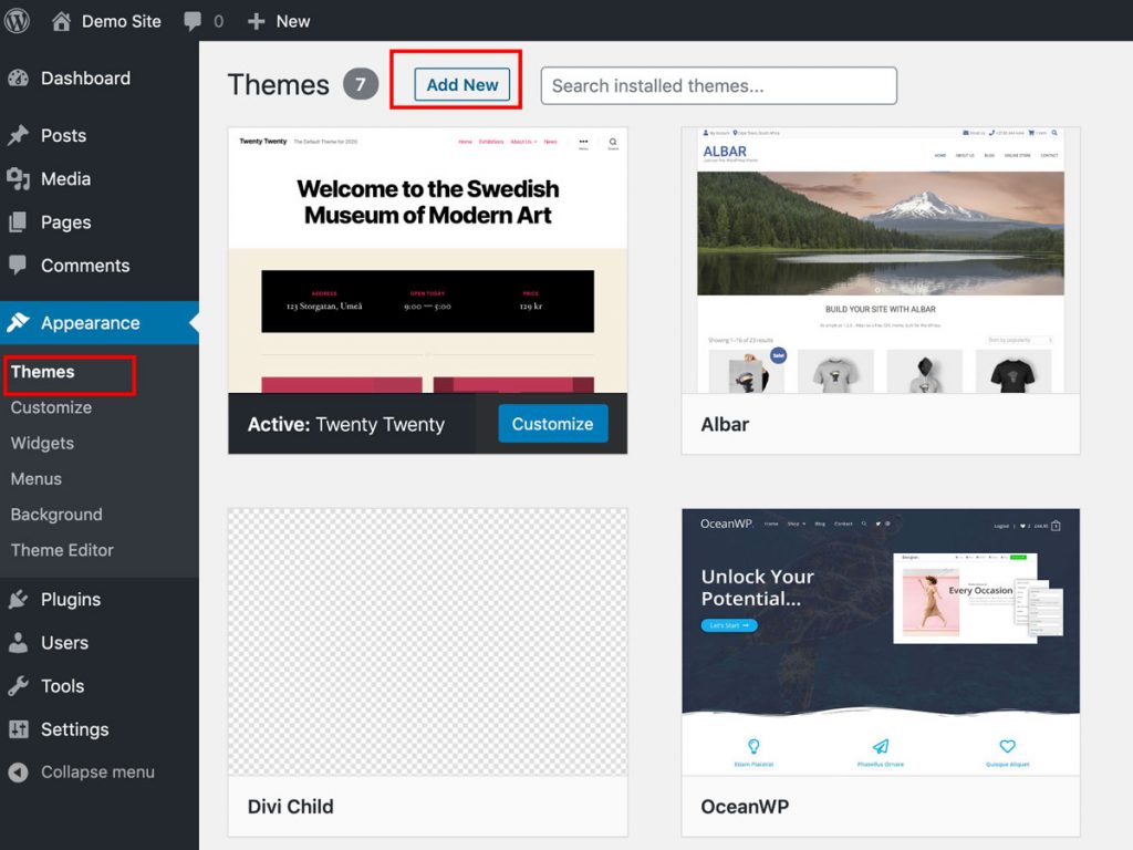 Now that you’re here you’ll be able to install a theme. On the left side, you’ll see a menu item named ‘Appearance’, hover over that and click ‘Themes’. On that page, you’ll need to click ‘Add New’.