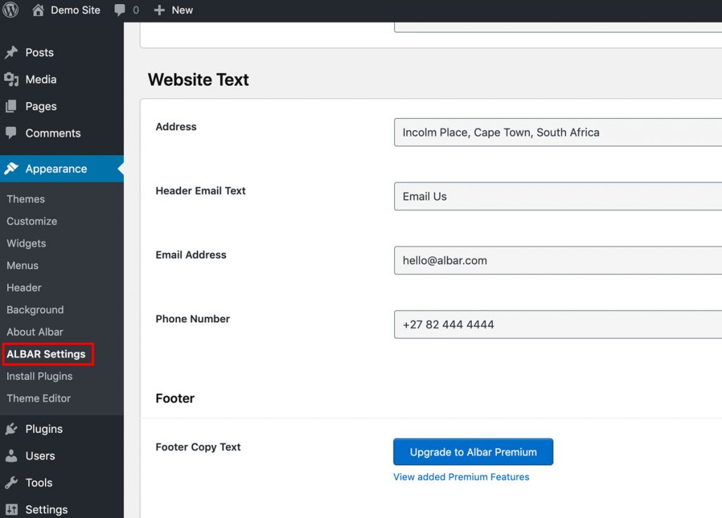 Awesome, now you’ve got a theme, and can start making changes. The first thing you’ll probably want to do is change the address and contact information. You do that in the ‘ALBAR Settings’ – it’s in the ‘Appearance’ menu on the left. See below: